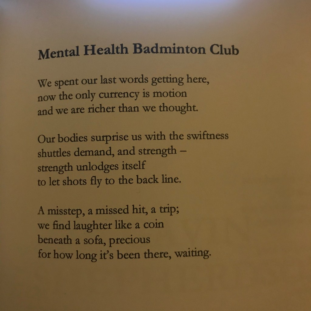 I’m sharing this rather late, but I’m over the moon to have two poems in the fourth issue of the wonderful Porridge Magazine. One piece is ‘Mental Health Badminton Club’, which I’ve included a sneaky photo of below. I won’t include a photo of my second piece, ‘Model’, as I ought to encourage you to go buy a copy and support a brilliant indie publisher!